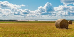 Hay bales on a farm along the ocean with the Confederation Bridg